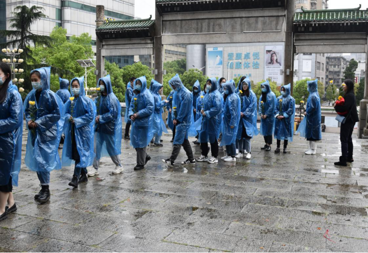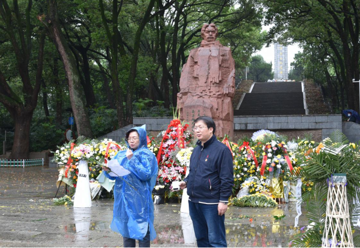 领导班子成员率师生代表向烈士敬献花篮,默哀,并依次来到石碑前为施洋烈士献上鲜花,最后列队深深鞠躬。