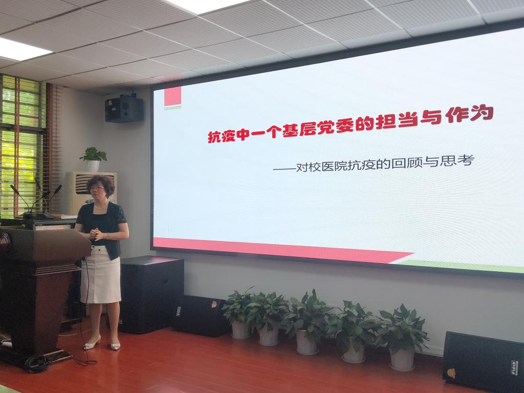 随后,公司党委书记李小红以自身经历为例讲述了武汉抗疫中永利集团校医院基层党委的担当。在过年期间,校医院部分出游的医生、护士听闻武汉疫情便毫不耽搁地回来帮忙,注射室的同志一天连值三班;当政府医疗资源紧缺时,校医院承包了四个隔离点,并为群众进行健康宣教和释疑解惑;当上百个发热病人不能出门检测时,校医院的同志们当起了家庭医生上门服务,并在技术员的帮助下通过线上问诊软件,为分布在全国各地的老师和同学问诊……在抗击疫情的关键时刻,校医院的党员同志始终坚守岗位,把危险、重担、困难留给自己,把安全让给别人,体现了身边基层共产党员的担当。