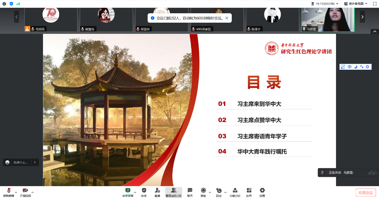 沈阳:本次党日活动共两个议题,第一个议题重温了习近平总书记对华科大青年学子的殷切寄语,擦亮了华科大党旗领航的闪耀标志,作为新时代华科大的青年研究生,我要牢记总书记嘱托,以“顶天立地、追求卓越”为己任,将“学在华科大”的品牌贯彻在平时,做有为的华科大青年!第二个议题是学习了选调生的基本政策,通过学习选调生知识,了解选调政策,为日后就业打下坚实基础。