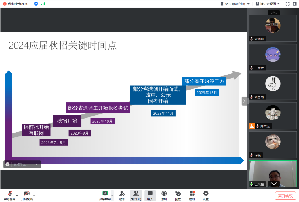 “勇往职前谈”环节,支部第三党小组王炎喆同志作2024届秋招求职经验分享。他结合自身求职准备、笔试、面试经验,强调了2024应届秋招的各阶段时间节点,并围绕行政单位、国有企业和民营企业等单位分别介绍了求职注意事项。基于个人求职阶段遇到的重点难点问题,他提出准备求职需要“有的放矢”,建议支部同志提前做好个人发展规划。