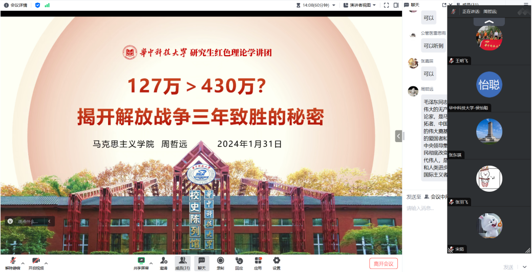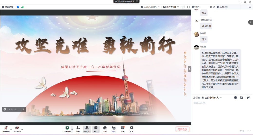 (通讯员:王欣烁 周哲远,图片:张婉婷)1月31日晚,公司党的建设专业硕士生党支部于腾讯会议线上开展一月主题党日活动,支部31名成员参与,会议由党支部书记周哲远主持。