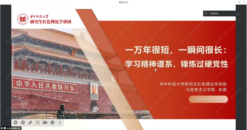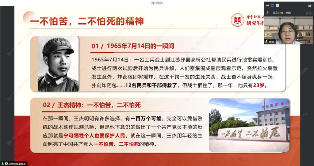 第一项,学党课,提修养。研究生红色理论学讲团助理讲师牟倩带来了以“一万年很短,一瞬间很长——学习精神谱系,锤炼党性修养”为题的微党课。她回顾了新民主主义革命时期,琼崖纵队与主力解放军并肩作战,历经二十三年艰苦奋斗,最终解放海南的故事。随后,她带领我们跨越时空,重温了新中国成立后,王杰同志“一不怕苦,二不怕死”的英雄气概,以及援藏干部孔繁森心系藏民、无私奉献的感人故事。最后,她聚焦于中国特色社会主义新时代,讲述了黄文秀同志在脱贫攻坚一线倾情投入、奉献自我的感人事迹。黄文秀做出了不负人民的抉择,同时,她呼吁大家要“努力做一个高尚的人,一个纯粹的人,一个有道德的人,一个脱离了低级趣味的人和一个有益于人民的人”。
