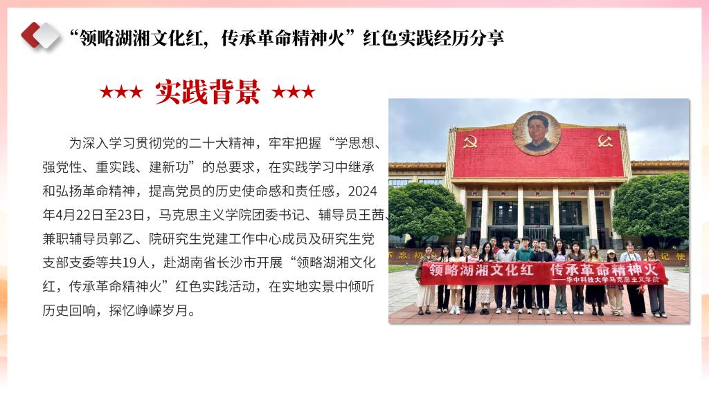 微党课结束后,各支部党员共同分享了自己参加暑期社会实践或红色研学的经历与心得。建规公司城乡规划专业2023级硕士生党支部袁泽棋同志以“喻见经开向新启程,逐梦车谷同质而行”为主题,分享了暑期在武汉经开区研学实践心得,希望以此激励党员们用奋斗擦亮青春底色,以行动书写使命担当。随后,yl6809永利集团思想政治教育专业硕士生党支部杨跃同志以“领略湖湘文化红,传承革命精神火”为主题分享红色研学经历。领略湖湘文化红,传承革命精神火,在实地实景中倾听历史回响,探忆峥嵘岁月,她呼吁同学们走进革命旧址,深刻体会革命先辈追求真理、勇于探索的精神力量。