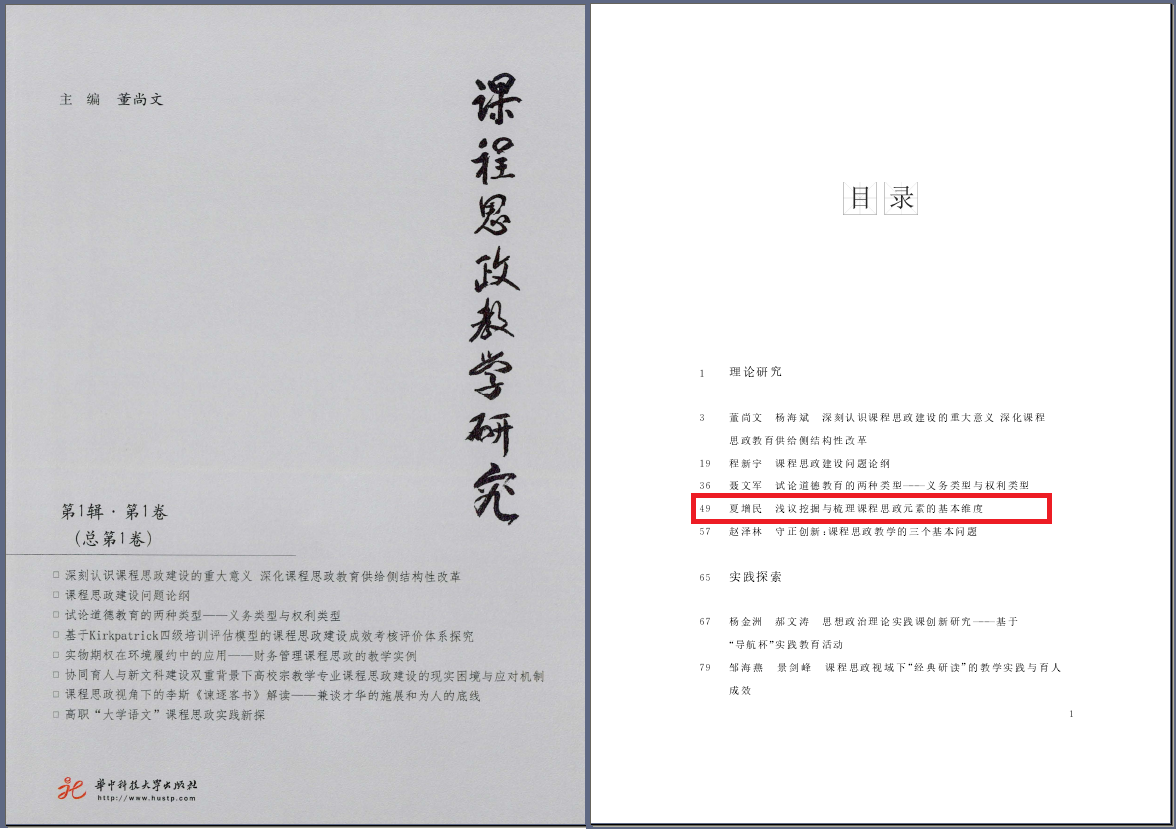 夏增民教授在《课程思政教学研究》第一辑发表《浅议挖掘与梳理课程思政元素的基本维度》,该文认为,在教学活动实践中,作为课程思政重点和难点的思政元素的挖掘与梳理仍存在若干问题,影响了专业课程育人功能的发挥。从而提出对课程思政元素的挖掘与梳理,既要体现专业课程鲜明个性和独有特色,也要对课程思政元素作一般共性意义上的细分的观点,并进一步将划分课程思政元素的维度归为自基础到高阶的七个维度:健全人格、公民意识、基本国情、主流价值观、文化素质、政治哲学和政治信念。