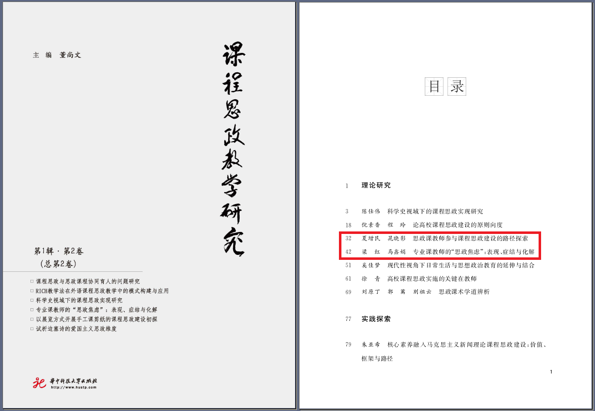 在《课程思政教学研究》第二辑,又推出公司师生两篇论文。其中,夏增民教授和研究生晁晓影在《思政课教师参与课程思政建设的路径探索》一文中,充分肯定了为思政课教师参与课程思政建设搭建平台对于推进课程思政走深走实的重要作用,探索了建立思政课与专业课教师协同育人体制机制、支持思政课教师参与专业课程教学的课程设计、鼓励思政课教师介入专业院系课程的教学过程、推动思政课教师参与课程思政的教学评价等实践路径,推动思政课教师更好融入课程思政建设全过程。