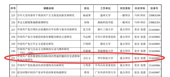 近日,全国哲学社会科学工作办公室公布了2023年国家社会科学基金年度项目和青年项目立项名单,我院文红玉教授获得重点项目立项资助。