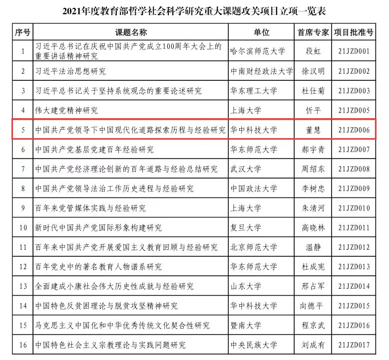 昨日,教育部社会科学司在教育部官网公布2021年度教育部哲学社会科学研究重大课题攻关项目的评审和公示结果,公司董慧教授申报的《中国共产党领导下中国现代化道路探索历程与经验研究》获批准立项。