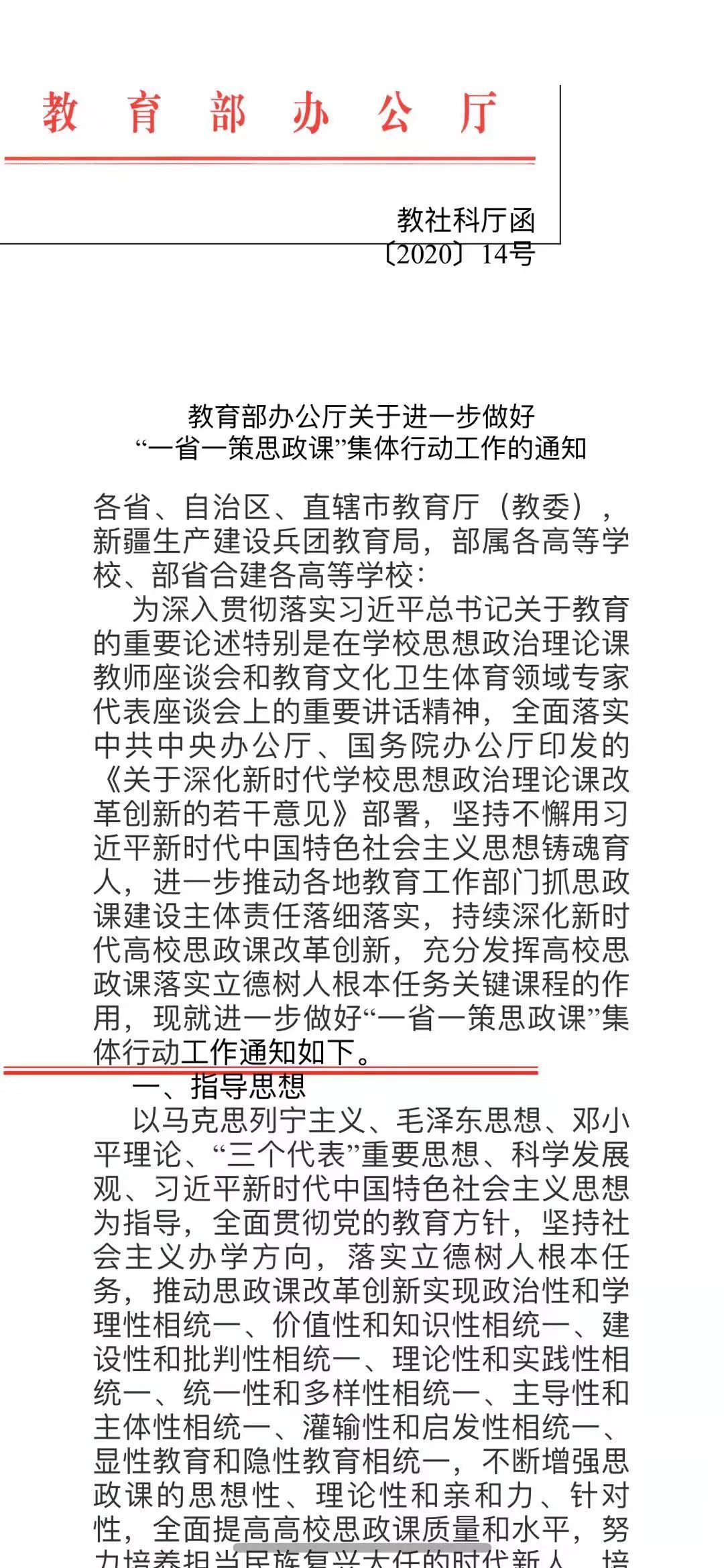 根据教社科厅函(2020)14号文件,教育部办公厅日前公布了新一轮的“一省一策思政课”集体行动。根据这个文件,公司长期提倡并参与的“中国系列”思政选修课再次入选,与上次第一轮有两点不同:其一,正式将类似“深度中国”的课程定位为“中国系列”思政选修课;其二,省内18家兄弟马院与公司一道参与建设。