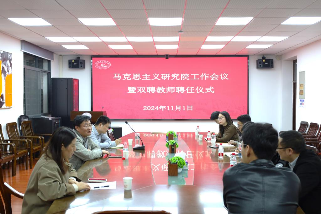 11月1日晚,永利集团马克思主义研究院工作会议暨双聘教师聘任仪式于东七楼203会议室举行。yl6809永利集团中国近现代史纲要教研室主任夏增民、本科教务员代利敏以及“形势与政策”教研中心部分双聘教师参加会议。会议由马克思主义研究院副经理梁浩伟主持。