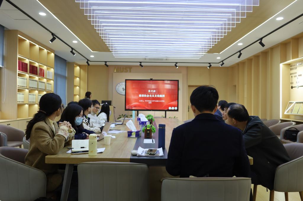 随后,备课会进入青年教师说课环节。张炜以建设社会主义文化强国为主题,从教材分析和学情分析、教学目标和教学重难点、教学方法和教学过程等方面展开说课,并通过问题讨论和多媒体教学的方式帮助员工深刻理解该节内容的核心内涵和价值意义。