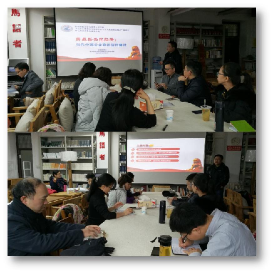何为“塔西佗陷阱”?我们要如何认识塔西佗陷阱?又应该怎样跨越塔西佗陷阱? 围绕这一系列问题,余泓波博士展开了以“跨越塔西佗陷阱:当代中国公众政治信任建设”为主题的讲课。在授课中,余泓波老师以“从塔西佗陷阱看公众政治信任、中国公众政治信任的纵向变迁和横向比较、产生信任的两条理论脉络,以及如何跨越塔西佗陷阱,建设民众的政治信任”四个部分展开论述。通过严密的逻辑、丰富的案例、翔实的数据、生动的图表,加深了老师们对该主题的认识与把握。余老师讲完之后,老师们围绕“民众对政府抽象层面的信任与具体事件中的信任是否存在差异”、“公众政治信任横向比较中区域比较的优势”、“群众路线与政府公信力的关系”等进行了热烈讨论。通过讨论,老师们表示收获颇丰,更加深刻地认识到了“走群众路线”、“以人民为中心的发展”等党的理论的重要意义与实践价值。