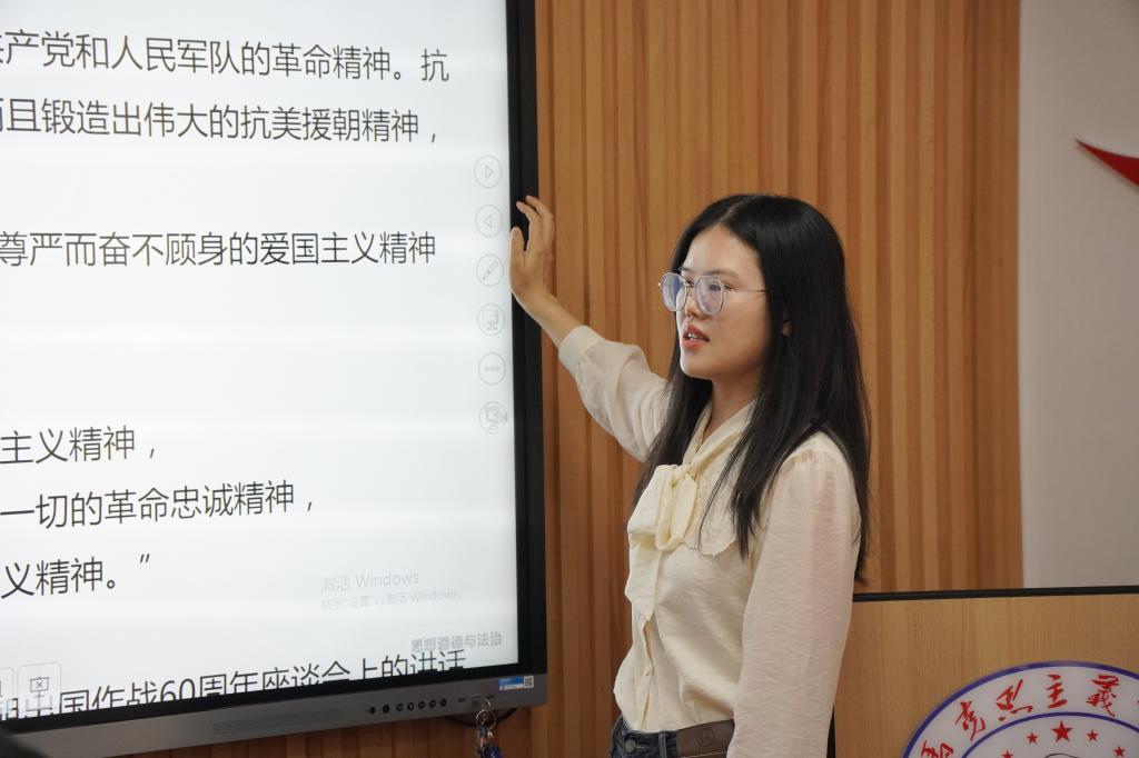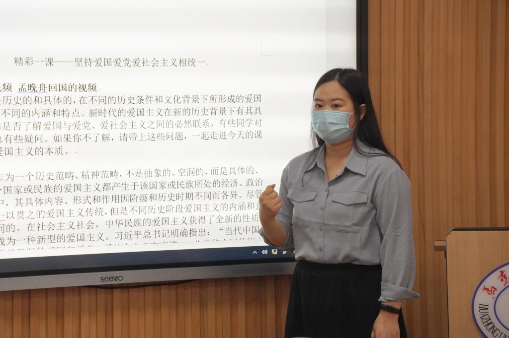 熊雅妮以《坚持爱党爱国爱社会主义相统一》为题,以孟晚舟回国的视频素材引入,展现了爱国主义的具体性和现实性,进而详细解读了爱党、爱国与爱社会主义三者之间不可分割的必然联系,说明了三者相统一的表现形式和实践路径。