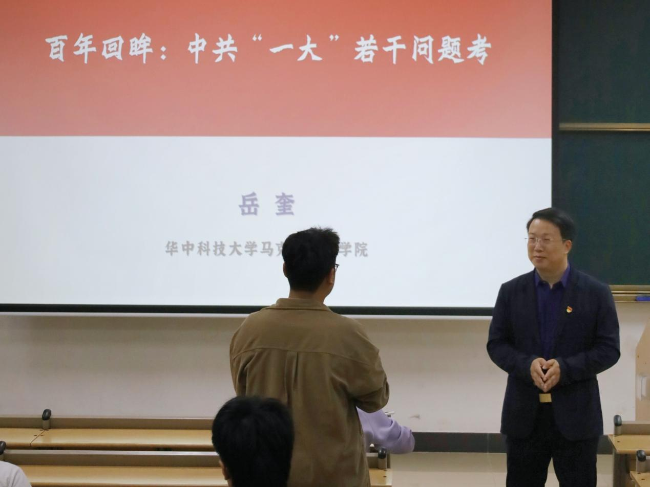 岳奎教授以“中共一大是什么时候召开的?”这一问题为切入点,从“中国共产党诞生日的由来”“‘一大’7.23召开的提出”“‘一大’开幕日期考证”“‘一大’党纲中的蹊跷”“‘一大’闭幕日期考证”五个方面,带领同学们穿越时空,从历史事件考证的全新角度重温这件开天辟地的大事。