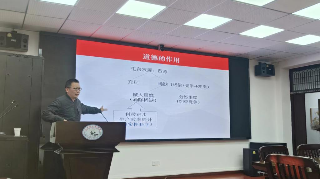 在章节磨课环节中,张蕾和阮丽萍就德法教材法治部分的教学设计分别展开论述,并对教学过程中的具体细节逐一进行了分享。接着,赵志坚针对德法教材第五章进行说课展示。他以思想实验为课程引入点,就道德的本质及作用进行了深入浅出的讲解,为大家带来一堂生动精彩的演说课。