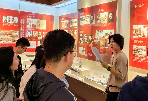 创新、鲜活的教学形式让同学们融入到了教学情景当中并收获满满。讲解员工商管理2004班瞿文琳同学说道:“老师课堂上的讲解让我对八七会议的历史有了进一步的认识;老师的指导和对讲解的准备使我拓宽了视野,也更深入地理解了伟大历史转折的深刻意义。现场的讲解虽然让我备感压力,但是也极大地锻炼了自己的能力。”电信2207班许馨予同学提到:“这样的第二课堂实景实践教学方式非常新颖,虽然我没有成功报名讲解员,但是同学们的介绍将实物、图片与历史相结合,使历史故事真实生动地还原在我们眼前,也使我学习到了很多书本和课堂之外的知识。”