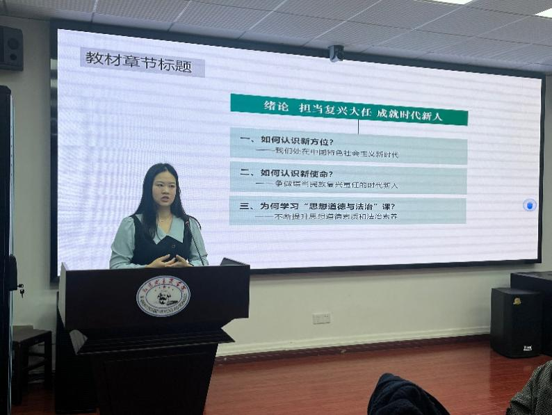 熊雅妮围绕《德法》教材绪论内容,从绪论重要性、新教材修订细节、课程教学方法、教学内容设计四个方面展开讲解,并对绪论第一部分第二讲内容进行了说课示范。
