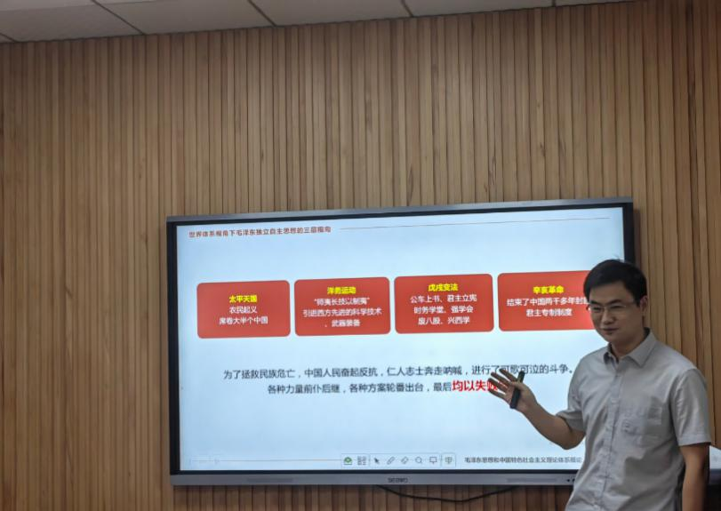 备课会上,沈孝鹏老师进行教学展示。他分别围绕“中国共产党以决议总结历史的基本特征”、“世界体系视角下毛泽东独立自主思想的三层指向”、“中国特色大国外交中国际和平建设之道”三个备选主题展开讲授。沈孝鹏条理清晰的逻辑框架、丰富有趣的教学内容、沉稳从容的讲授风格得到了与会教师们的一致肯定。