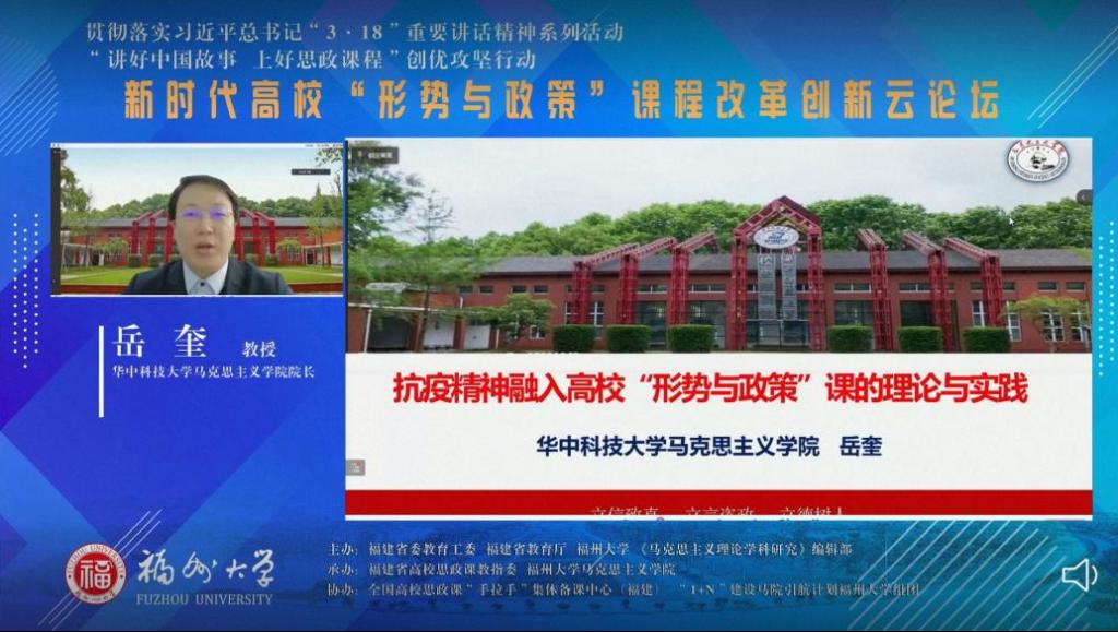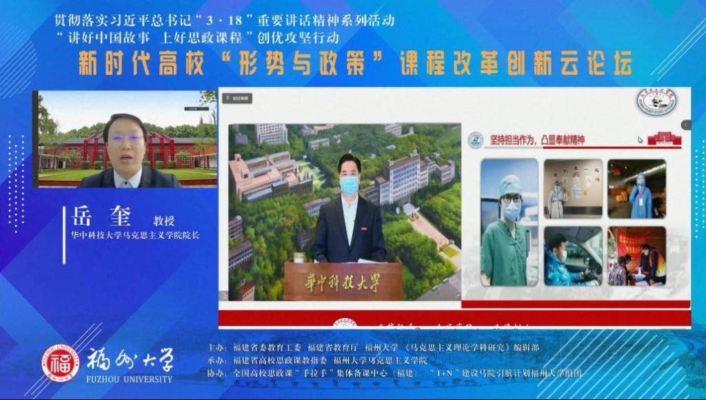 3月19日,由福建省高校思政课教指委与福州大学yl6809永利集团联合承办的新时代高校“形势与政策”课程改革创新云论坛在线上举行,来自全国不同高校近12000名思政课教师及员工线上参会。公司岳奎教授应邀参会并做题为“抗疫精神融入高校‘形势与政策’课程的理论与实践”的主题报告。