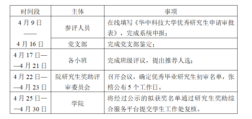 1.3月28日-4月20日,院系评选细则公布给全体毕业生,并严格按照评选条件和要求组织评选。由员工本人在“研究生奖助综合服务平台”http://yjsjz.hust.edu.cn/web/home/index/中在线填写《永利集团优秀研究生申请审批表》,线下须按照研究生守则由党支部或班委会对毕业生进行毕业鉴定,鉴定通过者,结合鉴定情况和历年表现,研究生导师、辅导员和院系副书记逐级进行在线审核。
