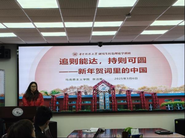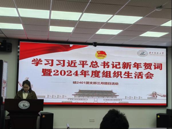 会议伊始,研究生红色理论宣讲团讲师张洁雅带来了微党课“追则能达,持则可圆——新年贺词里的中国”。张洁雅深入解读了习近平总书记的新年贺词,介绍了新年贺词的起源与发展,生动讲出了历代贺词中的时代强音与家国情怀,使支部成员深刻领略到国家发展的脉搏与方向,感受到贺词中所蕴含的深厚情感与坚定信念。