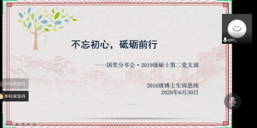 为纪念中国共产党成立99周年,将建党活动与学习两会精神、战疫精神结合起来,深化主题教育,筑牢思想基础,6月30日下午,yl6809永利集团2019级硕士生第二党支部开展了以“迎党的生日、讲战疫故事、悟初心使命”为主题的党组织生活会。会议主要分为讲授党课、朋辈交流、讨论学习、知识竞赛四个环节,2016级博士生邱思纯学姐和支部党员共同参与。