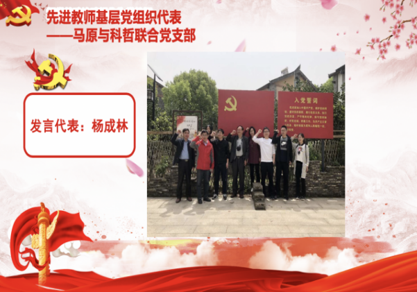 蔡孝恒老师立足于自身成长与工作基础,分享了任课、科研和帮助年轻教师成长的体会感悟;杨成林老师作为马原与科哲联合党支部书记,以“迎党的生日 悟初心使命”为主题介绍了支部的组织生活会情况、科研工作情况和员工培养情况,特别介绍了支部教师党员在疫情期间参加志愿服务活动的情况和支部教师党员分享的防疫抗疫心得体会。
