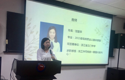 2015级优秀毕业生代表逐一分享就业经验与心得体会。刘宝平从“招聘信息获取平台、信息遴选和辨别以及笔试面试的准备”三个方面分享了她在求职教师岗位过程中的一些经验。