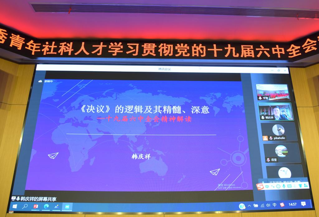 韩庆祥作题为“新时代加强党的长期执政能力建设的理论创新和实践进展”的主旨报告,从六个方面对《中共中央关于党的百年奋斗重大成就和历史经验的决议》进行了总体性的阐释。一是用根本问题解释百年奋斗,二是用百年奋斗支撑重大成就,三是用重大成就确证历史意义,四是从历史意义提升历史经验,五是以成就贡献支撑两个确立,六是用两个确立确保强国复兴。他强调,要树立和强化问题意识,学通弄懂《决议》,必须首先明确“党是社么,党要干什么”这一根本问题。