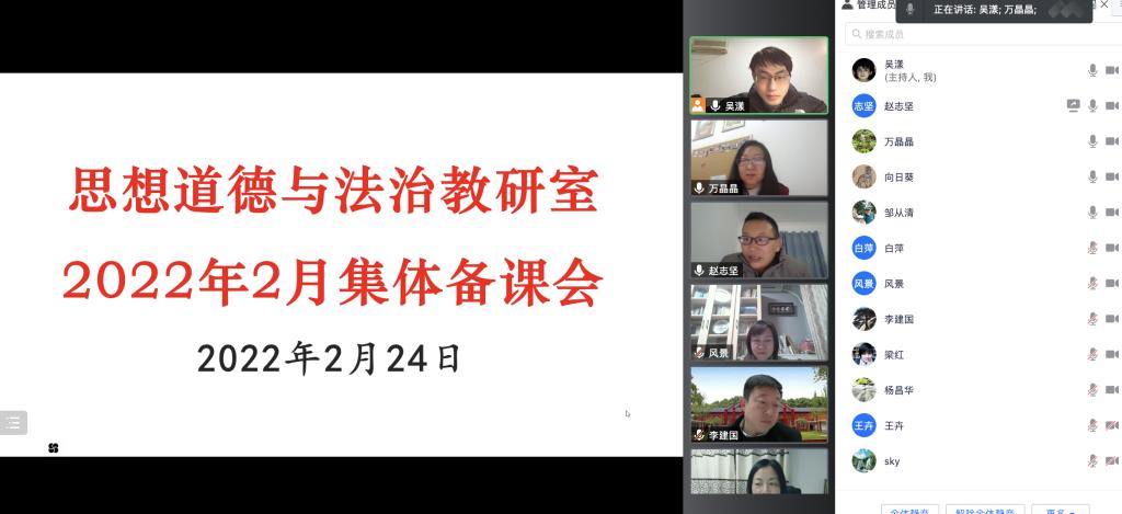 2022年2月24日晚,思想道德与法治教研室集体备课会以线上方式举办,会议由教研室主任万晶晶老师主持,教研室所有教师均积极参加。