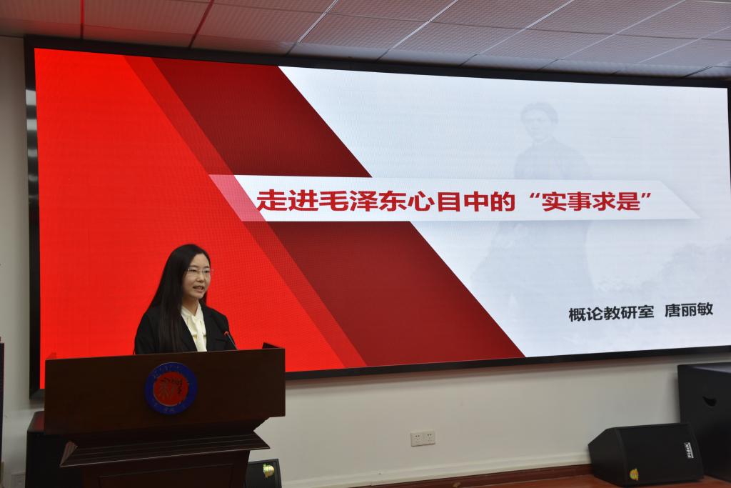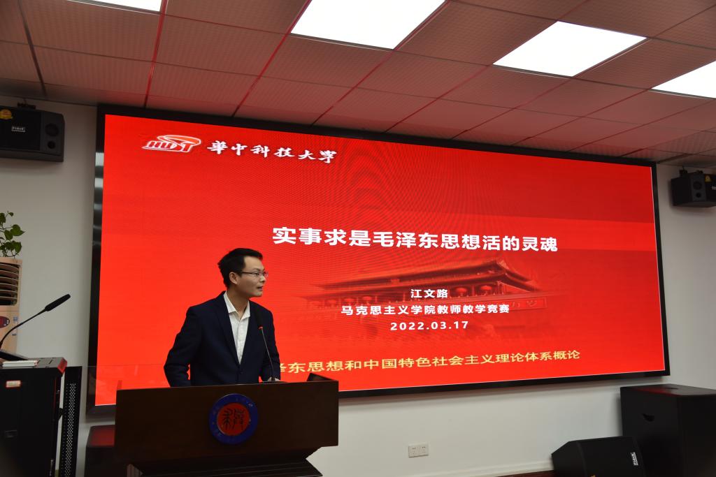 青年教师代表沈孝鹏、唐丽敏、江文路、刘姗、曾允、魏维和潘博参加了此次教学竞赛。沈孝鹏、唐丽敏和江文路分别以《从世界体系视角看毛泽东的独立自主思想》、《走进毛泽东心目中的“实事求是”》和《实事求是是毛泽东思想活的灵魂》为题做了《毛泽东思想和中国特色社会主义理论体系概论》教学展示。
