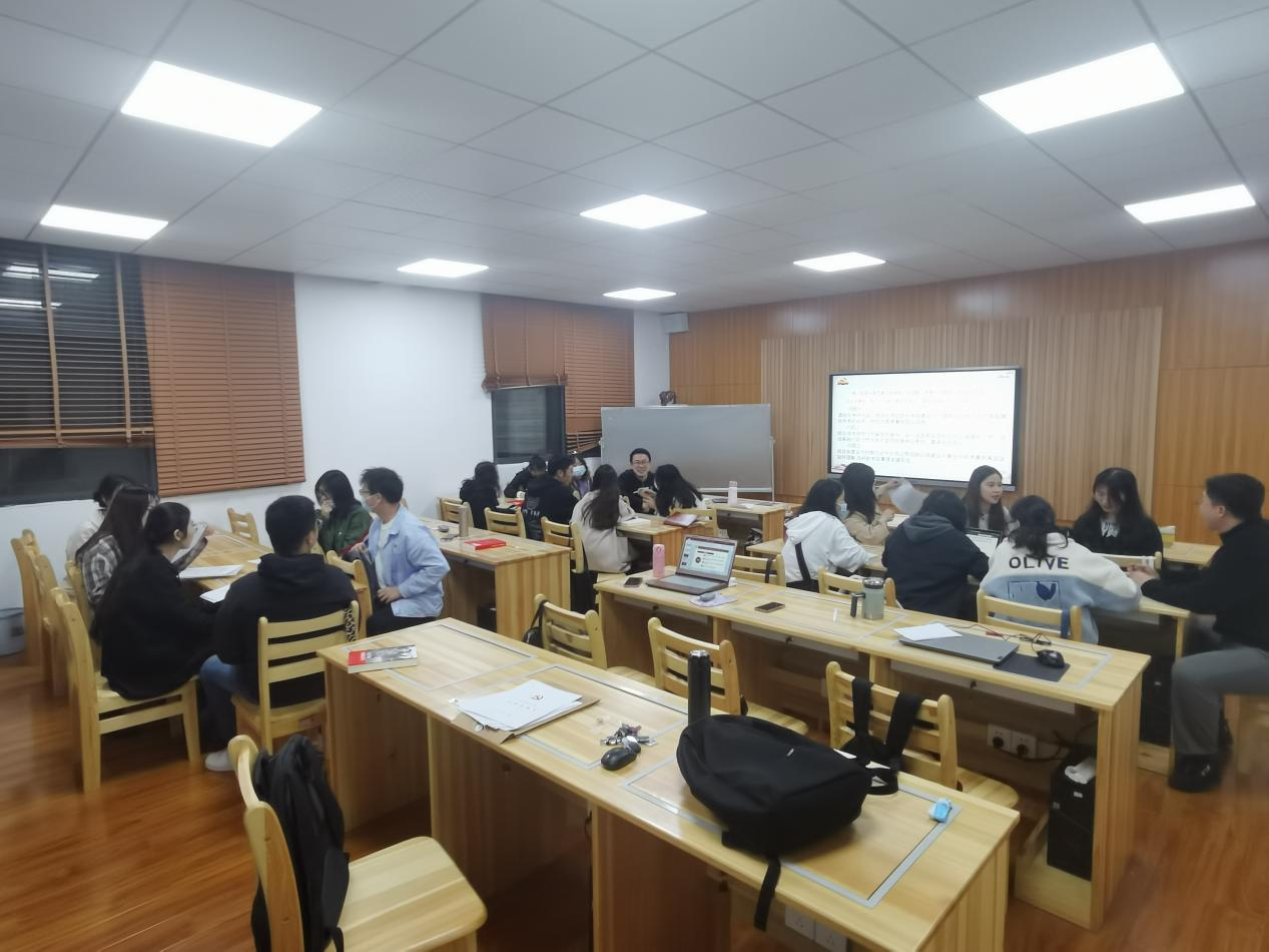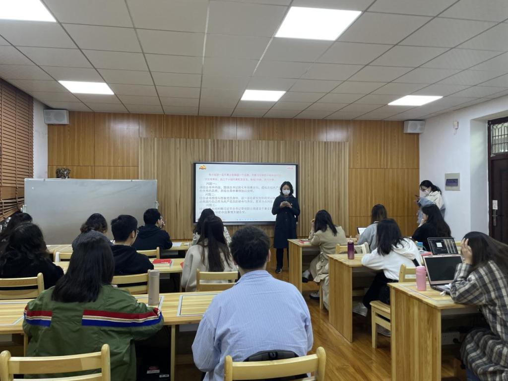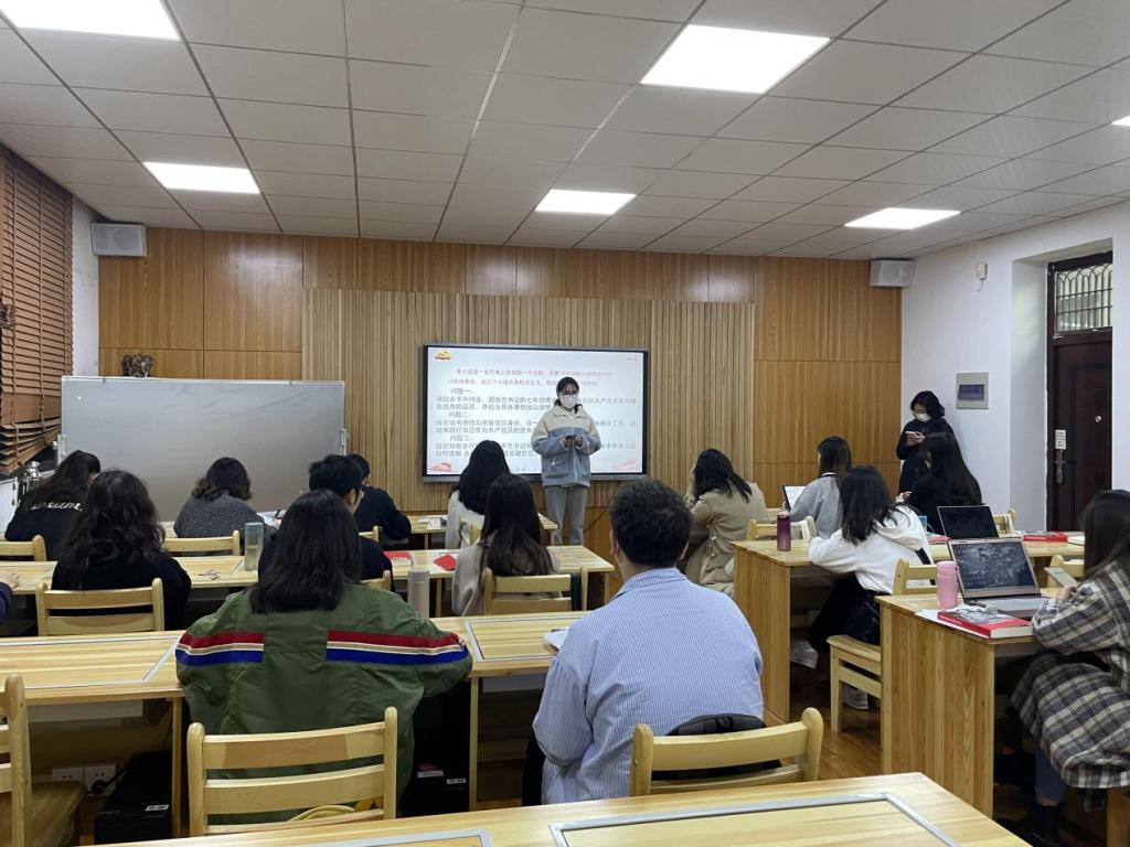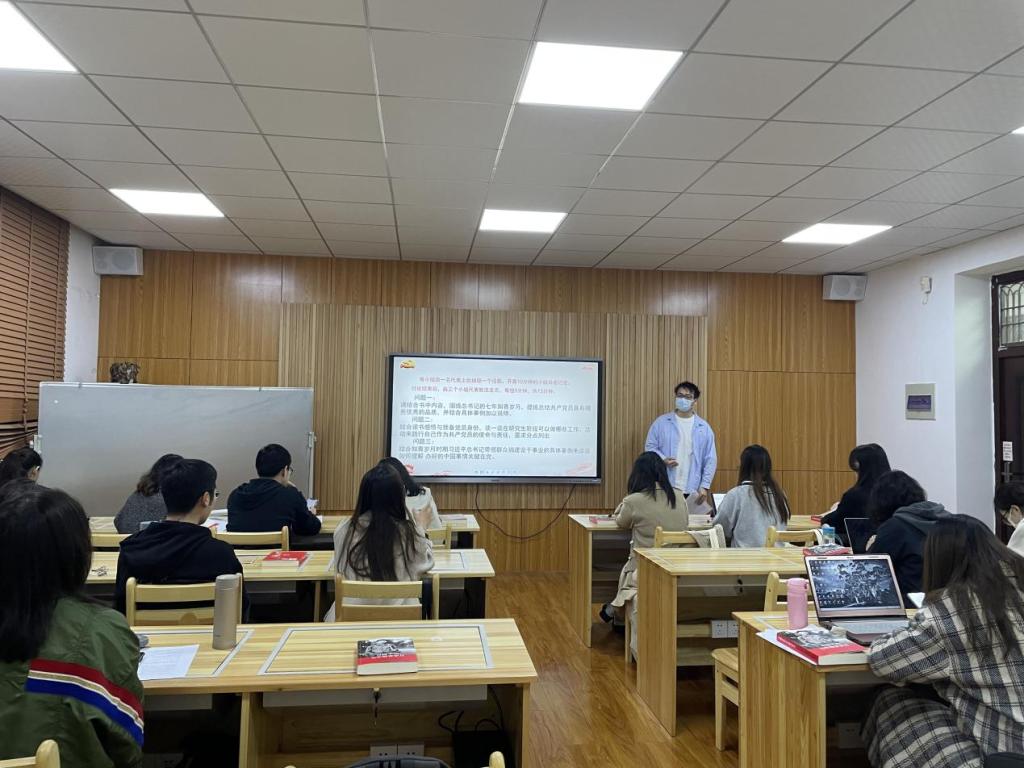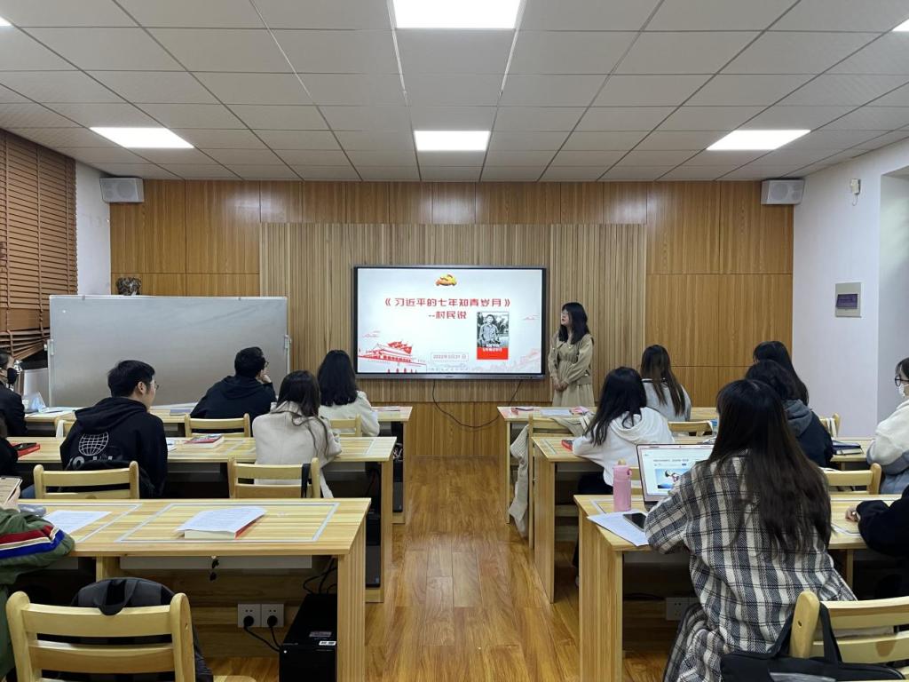 第二部分是《习近平的七年知青岁月》读书收获汇报。各支部预备党员同志以小组为单位进行读书交流,分别依据知青说、村民说、各界说中的内容,谈感想感悟、谈党性修养、谈自身发展。首先,2021级第一党支部代表毛明凤同志结合书中总书记办沼气等具体事例,介绍了总书记在梁家河插队时期村民对总书记的高度评价,体现了总书记吃苦耐劳、全心全意为人民服务的优良精神。