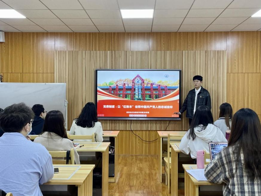 本次活动共分为三个部分。第一部分是微党课学习。由研究生红色理论学讲团讲师、yl6809永利集团2020级硕士生第一党支部书记张泽民带来“党费制度:以‘红账本’诠释中国共产党人的忠诚信仰”主题微党课,按照时间顺序向大家讲解了从新民主主义革命时期、社会主义革命与建设时期、改革开放与社会主义现代化建设时期到中国特色社会主义新时代党费制度由初创、探索、发展到系统化、科学化的日益完善的发展历程。最后他阐述了党费的意义:“交纳党费是党员对党组织的忠诚信仰和期盼,是党员不忘初心的身份认同,是全面从严治党的重要环节。作为党员,我们要强化党员党章意识和组织观念,提醒自己是党组织的一员,要为组织尽义务,要承担党的责任。做合格党员,从主动、按时、足额交纳党费开始。”