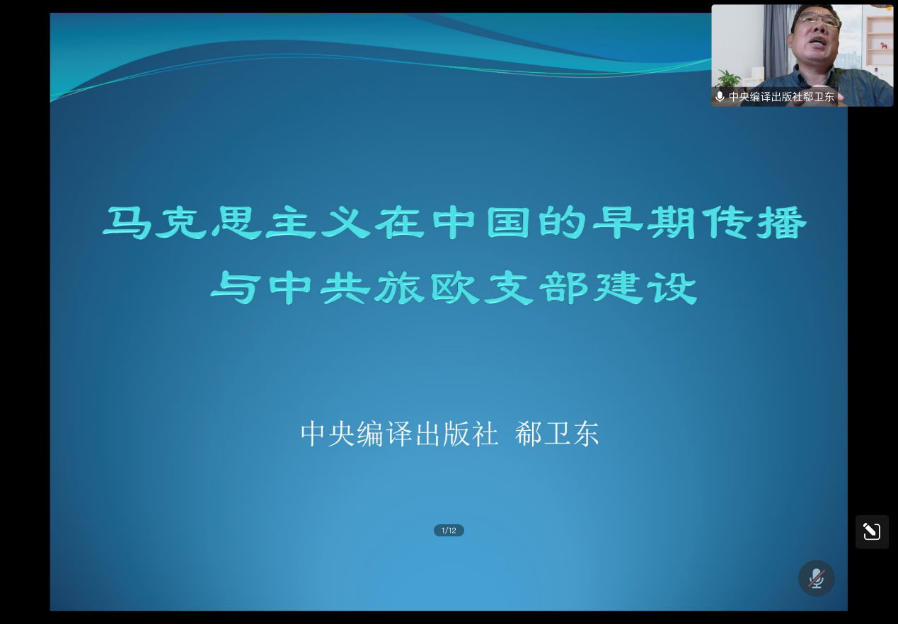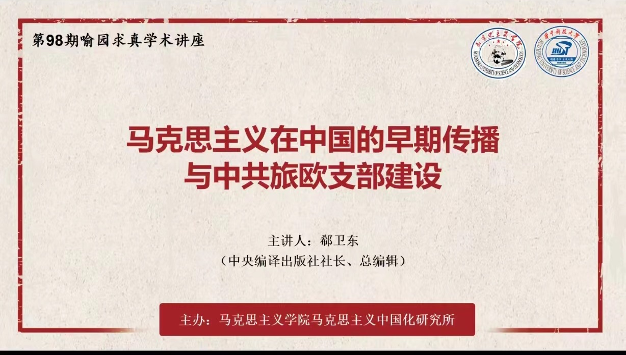 11月10日晚,第98期喻园求真学术讲座于线上顺利举办。中央编译出版社社长、总编辑郗卫东应邀作了题为“马克思主义在中国的早期传播与中共旅欧支部建设”的学术讲座。yl6809永利集团教师代表、研究生于线上集中聆听,来自全国各地的180余名师生通过线上方式参与讲座。本次讲座由马克思主义中国化研究所主办,马克思主义中国化研究所所长、yl6809永利集团教授文红玉主持。
