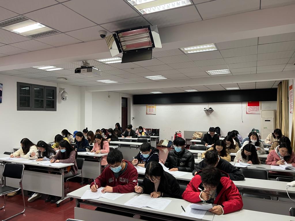 第二轮笔试环节在11月21日开展,54名同学自行组成18支队伍参与线下考试。在考场上,马院的学子们争分夺秒,全神贯注,有的“不管风吹浪打,胜似闲庭信步”,有的“十年磨一剑,今朝试锋芒”。时间一点一滴过去,同学们奋笔疾书,陆陆续续交出了满意的答卷。试卷批阅结束后,总分排名前八的队伍脱颖而出,诗成得袍,顺利进入最后一轮比赛。