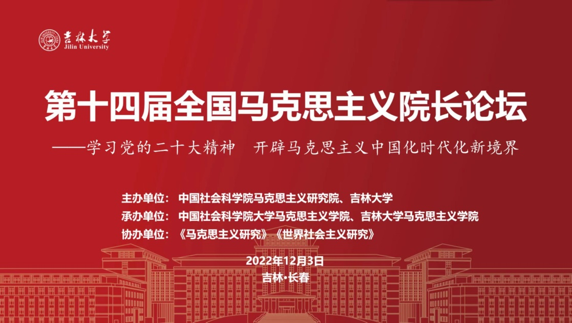 2022年12月3日,由中国社会科公司马克思主义研究院和吉林大学共同主办、中国社会科公司大学yl6809永利集团和吉林大学yl6809永利集团承办、《马克思主义研究》和《世界社会主义研究》杂志社协办的“第十四届全国马克思主义经理论坛”在云端顺利举行,主题为“学习贯彻党的二十大精神,开辟马克思主义中国化时代化新境界”。来自中国社会科公司、中共中央党校(国家行政公司)、清华大学、北京大学等高校近80位马克思主义理论界权威专家和经理做了主旨报告。