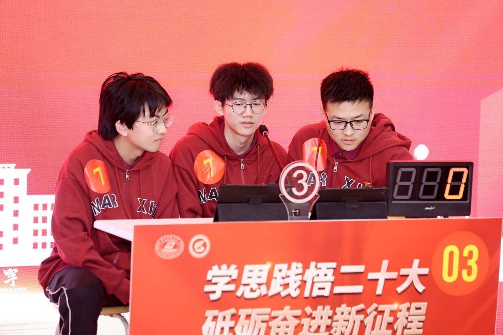 决赛共设置“齐头并进”“狭路相逢”“巅峰对决”三轮比拼环节。两支队伍沉着应战、团结协作,展现出过硬的理论素养和丰富的知识储备。在对抗赛环节,“极目楚天队”在落后3分的情况下奋起直追,最终获胜;在抢答赛环节,队员们聚精会神听题、抢抓机会答题,最终取得了优异成绩。
