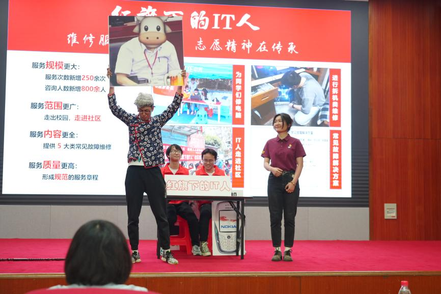 答辩现场,该联合团支部以“让青春在火热实践中绽放绚丽之花”为主题,从“学、思、践、悟”四个部分,以情景短剧、角色再现的形式展示了支部的特色团日活动。