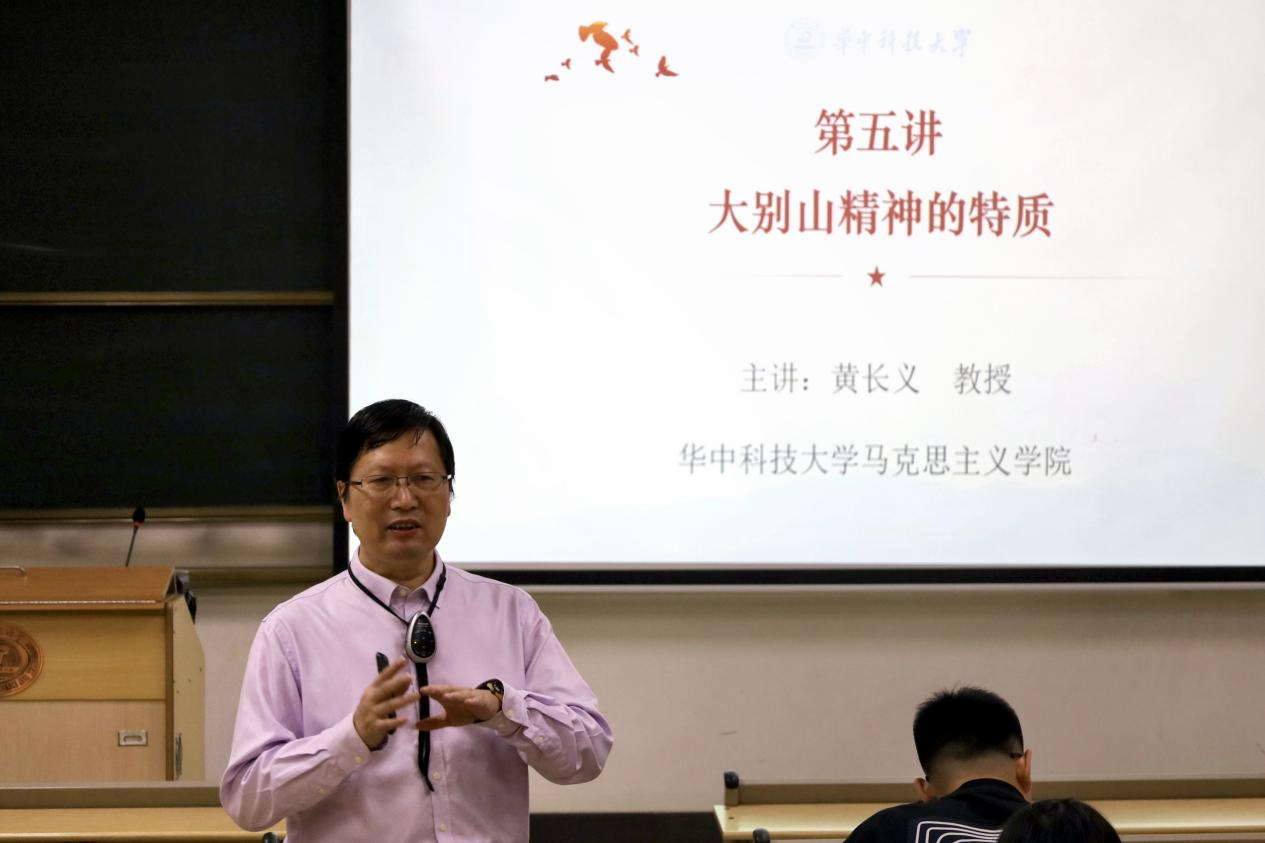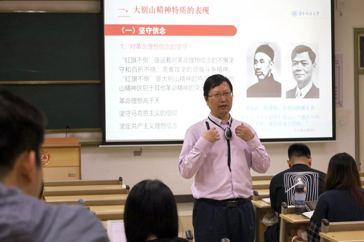 课程伊始,黄长义教授向同学们讲解了大别山精神的具体表现。他首先引用董必武的诗句“遵从马列无不胜,深信前途会伐柯”,介绍了大别山精神的第一个表现——坚守信念。所谓坚守信念,就是坚定革命理想信念、发扬顽强斗争精神、坚守党员初心使命。这既是大别山精神的特质,也是大别山精神区别于其他革命精神的突出特点。接着,他通过梳理创建鄂豫皖革命根据地、重新组建红二十八军、创建豫鄂边抗日根据地、开辟大别山革命根据地等四个历史阶段,展现出大别山代代相传的“红色基因”,具体呈现了大别山区党员群众“前赴后继”的英勇实例。随后,他对红四方面军的十六字军训“智勇坚定,排难创新,团结奋斗,不胜不休”进行逐一剖析,向大家展现了“不胜不休”的大别山精神。