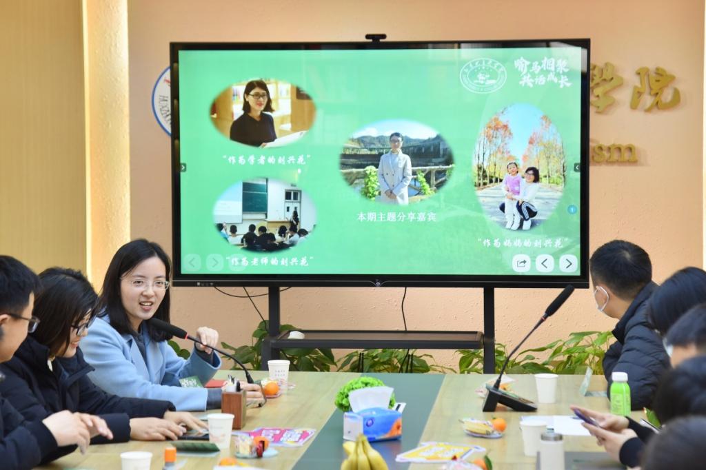 首先,青年教师刘兴花为大家带来主题分享。她围绕自己“学者”“教师”和“母亲”三重身份,为大家介绍了自己在人生道路各阶段对不同角色的适应过程,以及当下在三重身份中切换和转变的心得与困惑。不少青年教师在聆听分享后表示感同身受,一些老师也针对其困惑,真诚地分享个人经验并提出相关建议。