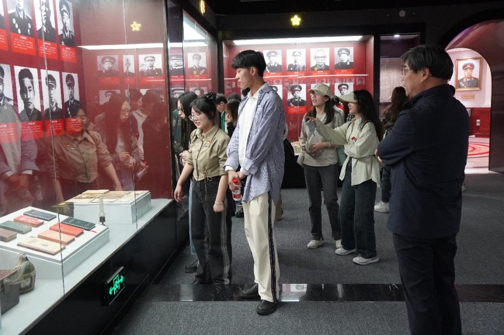 在讲解员的带领下,同学们参观了湖北军民抗战博物馆。作为纪念抗日战争胜利的重要场所,湖北军民抗战博物馆珍藏了大量的历史文物和照片,馆内设有多个特色陈列展,如“同仇敌忾——军民抗战展”“罄竹难书——日军罪行展”以及“鹰击长空——武汉空战展”等。透过珍贵的文物、照片和影像资料,同学们仿佛穿越时空,回到了那段艰苦卓绝的烽火岁月,对革命先烈的敬仰之情油然而生。
