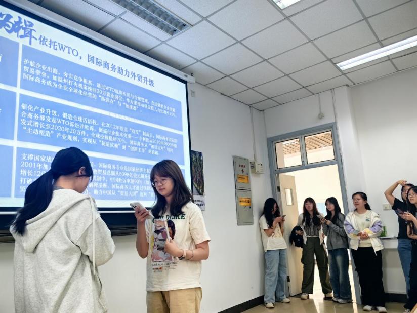 第一组的同学以《瓷渡重洋 商路新光》为主题,以短剧形式将国际商务专业知识与“国货出海”战略深度结合。选题围绕传统陶瓷文化符号,通过剧情展现国际营销、贸易规则等专业内容,既呼应国家推动文化产品走向世界的战略方向,也体现专业在跨文化商业实践中的桥梁作用,生动呈现了中外商业合作中的理念碰撞与价值共鸣。此次课堂展示不仅锻炼了小组成员的项目管理、创意策划能力,更以青年视角诠释了经济全球化背景下专业学子在文化互鉴与国际合作中的使命担当。